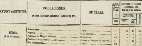En el año 1863 se publica un "nomenclátor" que enumera los sitios que están habitados en el pueblo o diseminados: casas, corrales, parideras de ganado, pajares, palomares, casetas o ermitas. Escucha tiene 335 habitantes y 66 casas se habitan todo el año y 21 de manera temporal, como corrales, chozas, cuevas, casetas, etc.; hay 38 lugares deshabitados. Pajares hay 16 y, en las afueras del pueblo, a 300 m. está la ermita y el palomar de Miguel Galindo. Parideras de ganado, casetas y albergues de pastores hay 40, cuatro de ellos tienen dos pisos.