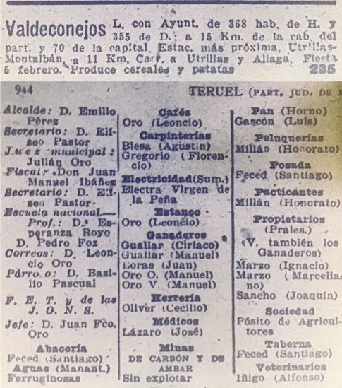 Si miras el Anuario del Comercio y la Industria de 1935 referido a Valdeconejos te llamará la atención la mención a un manantial de "aguas ferruginosas". Éstas eran buenas para purgar el cuerpo, curan las fiebres y disipan las afecciones calculosas. Pero aparte de eso, es curioso ver los servicios, tiendas y establecimiento de antes de la guerra en el pueblo: carpinterías, café, abacería, estanco, herrería, horno, peluquería, posada, taberna, veterinario, médico , magisterio, secretaría u oficina de correos. El alcalde es Emilio Pérez, el párroco, Basilio Pascual y la electricidad se suministra de Electra Virgen de la Peña de Aliaga.