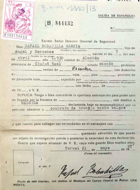 En 1956, una tragedia en una mina en Bélgica alcanzó los 262 fallecidos. Este año el Gobierno de España firma un convenio para enviar mano de obra necesaria a este país: mineros de Mequinenza, Andorra, Utrillas, Albalate, Valderrobres y Escucha iniciaron el camino a tierras belgas. Joaquín Pérez partió con 29 años y junto a él otros vecinos del pueblo; algunos en mayo y otros en noviembre. Se les realizaba un contrato de trabajo que se acompañaba de la partida de nacimiento, de un informe de conducta e informe negativo del Ministerio de Justicia (Dirección General de Prisiones). Algunos de los que fueron casados llevaron al tiempo a sus esposas a Bélgica. Además de Joaquín, partirían: Francisco Montero Alegría (contrato de trabajo en Francia), Antonio Castillo Sánchez, José Ramón Rosillo Soria, Rafael Bobadilla García, Rafael Moreno Torralbo, Tomás Bárcenas Mora, Manuel Castillo Sánchez, Emilio Pila Sánchez (contrato de trabajo en Francia y Bélgica) y Francisco Chavero Prieto (contrato de trabajo en Francia y Bélgica).